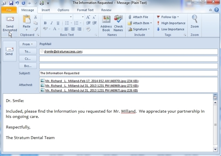Users can now encrypt and secure email and attachments via email with simple and affordable tools, integration directly with your email client software. A simple right-click – and you can attach an object to an outgoing email via Microsoft Outlook. An example would be be to choose your films or patient photos from within the patient chart. With a simple 'right-click' choose ‘Email’ or “Email to Contact’. Your Outlook mailbox should now launch and attach your objects, allowing you to address your communication and insert any related message, as shown: